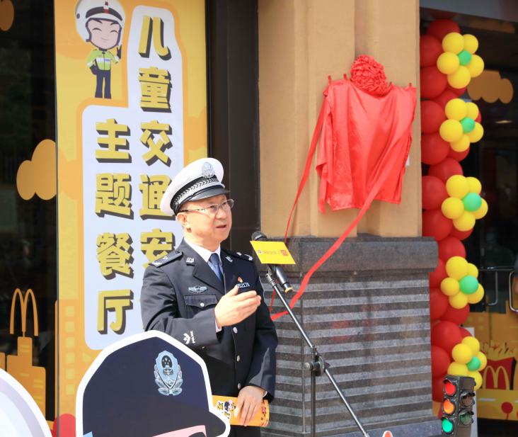 全國首家麥當(dāng)勞兒童交通安全主題餐廳(深圳市福田區(qū)東海城市廣場(chǎng)餐廳)啟動(dòng)儀式上,深圳市交警局副局長馮新毅致辭