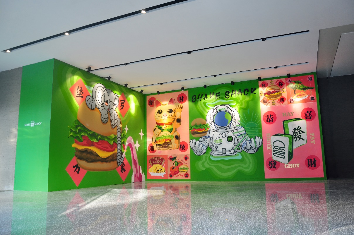 圍擋的室內(nèi)部分采用創(chuàng)新的互動形式,由藝術(shù)家現(xiàn)場親自手繪完成的8幅單元涂鴉畫板組合而成。藝術(shù)家用摩登時尚的波譜藝術(shù),向當?shù)刭e客們奉送出中國傳統(tǒng)的祝福及Shake Shack的活力熱情。