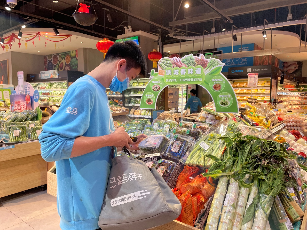 消費(fèi)者通過手機(jī)下單購買春菜,盒馬小二正在揀貨