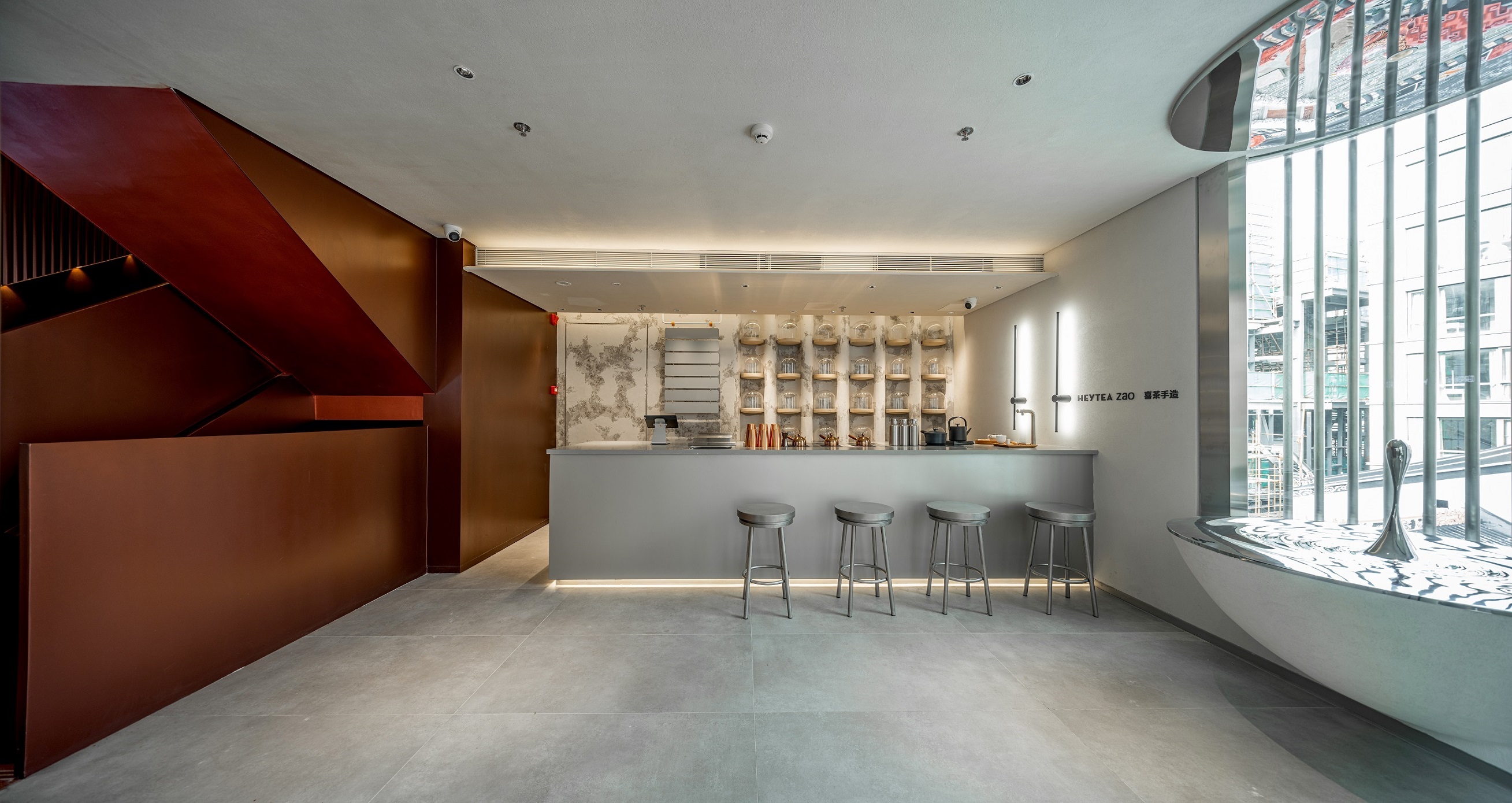 在內(nèi)部設(shè)計(jì)上,喜茶同樣以創(chuàng)新的功能空間設(shè)置和突破性設(shè)計(jì),呼應(yīng)每一樓層的手造主題,升級了消費(fèi)者的空間體驗(yàn)。喜茶將一樓正門墻體改造為玻璃移門,塑造出通透的門店空間;變封閉窗戶為開放的門,讓顧客看得見手造產(chǎn)品的全過程。此外,在用色與材質(zhì)搭配上,門店內(nèi)部整體采用嶺南復(fù)古紅與現(xiàn)代極簡白搭配,做舊復(fù)古肌理漆與現(xiàn)代化金屬材質(zhì)呼應(yīng),不僅有效進(jìn)行功能分區(qū),還體現(xiàn)歷史感與現(xiàn)代感的對比、融合。