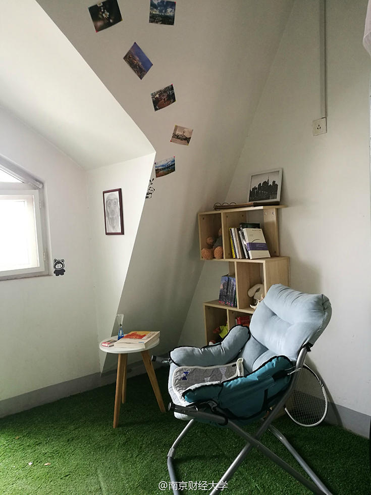綿綿的草坪、充滿設(shè)計感的書架、掛著素描畫的墻……難以想象這是四個19歲男生的寢室。南京財經(jīng)大學西苑9幢男生宿舍頂樓602寢室,住著4位“世外高人”—— 涂貴平、柯毅、劉以康和廉鎮(zhèn)宇,他們用事實告訴大家,男生宿舍文藝起來,可絲毫不輸女生。