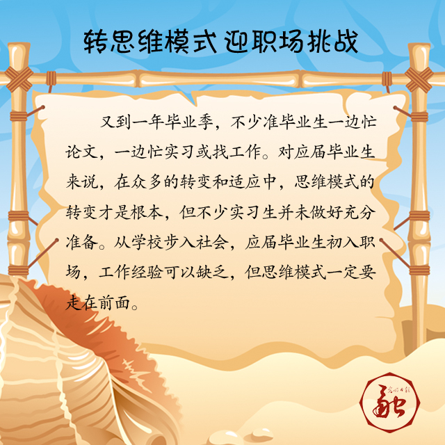 又到一年畢業(yè)季,不少準(zhǔn)畢業(yè)生一邊忙論文,一邊忙實(shí)習(xí)或找工作。對(duì)應(yīng)屆畢業(yè)生來說,在眾多的轉(zhuǎn)變和適應(yīng)中,思維模式的轉(zhuǎn)變才是根本,但不少實(shí)習(xí)生并未做好充分準(zhǔn)備。從學(xué)校步入社會(huì),應(yīng)屆畢業(yè)生初入職場(chǎng),工作經(jīng)驗(yàn)可以缺乏,但思維模式一定要走在前面