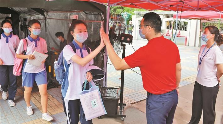 今年中考比往年推遲了一個(gè)月,考試期間天氣炎熱,為了給考生創(chuàng)造優(yōu)良的考試環(huán)境,在做好組考工作的同時(shí),市、區(qū)教育和招考部門、各考點(diǎn)以人為本,優(yōu)化服務(wù)考生措施。各考點(diǎn)均設(shè)置了更衣室,準(zhǔn)備了雨傘、毛巾、備用校服、涼茶、糖水,搭建遮陽(yáng)避雨長(zhǎng)廊,安排候考休息室,努力營(yíng)造安全舒適的考試環(huán)境。許多考點(diǎn)提前聯(lián)系疾控部門,對(duì)考點(diǎn)進(jìn)行專業(yè)消殺,并為突發(fā)疾病的考生提供醫(yī)療服務(wù)和現(xiàn)場(chǎng)核酸采樣、送檢服務(wù),為考生提供便利。