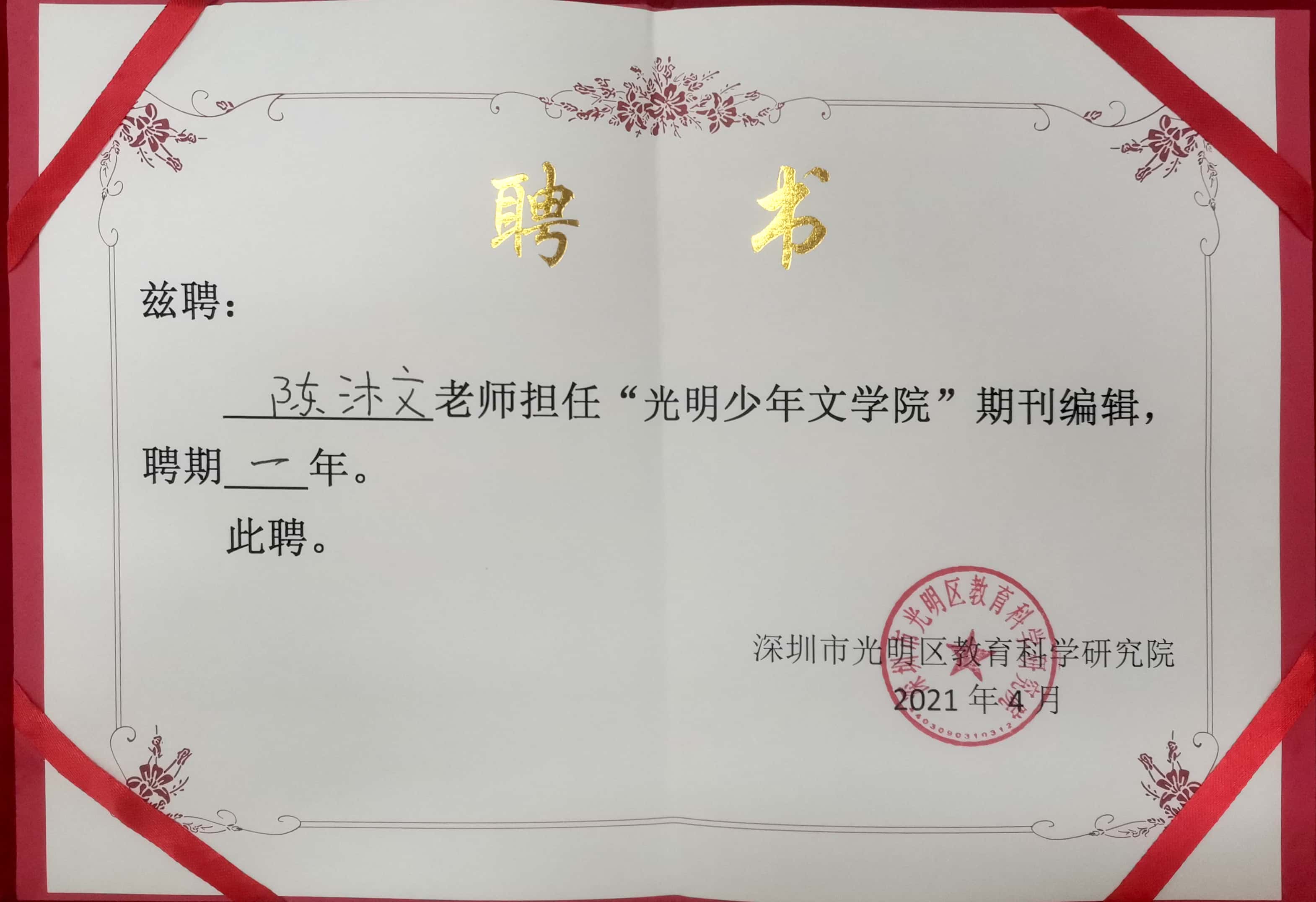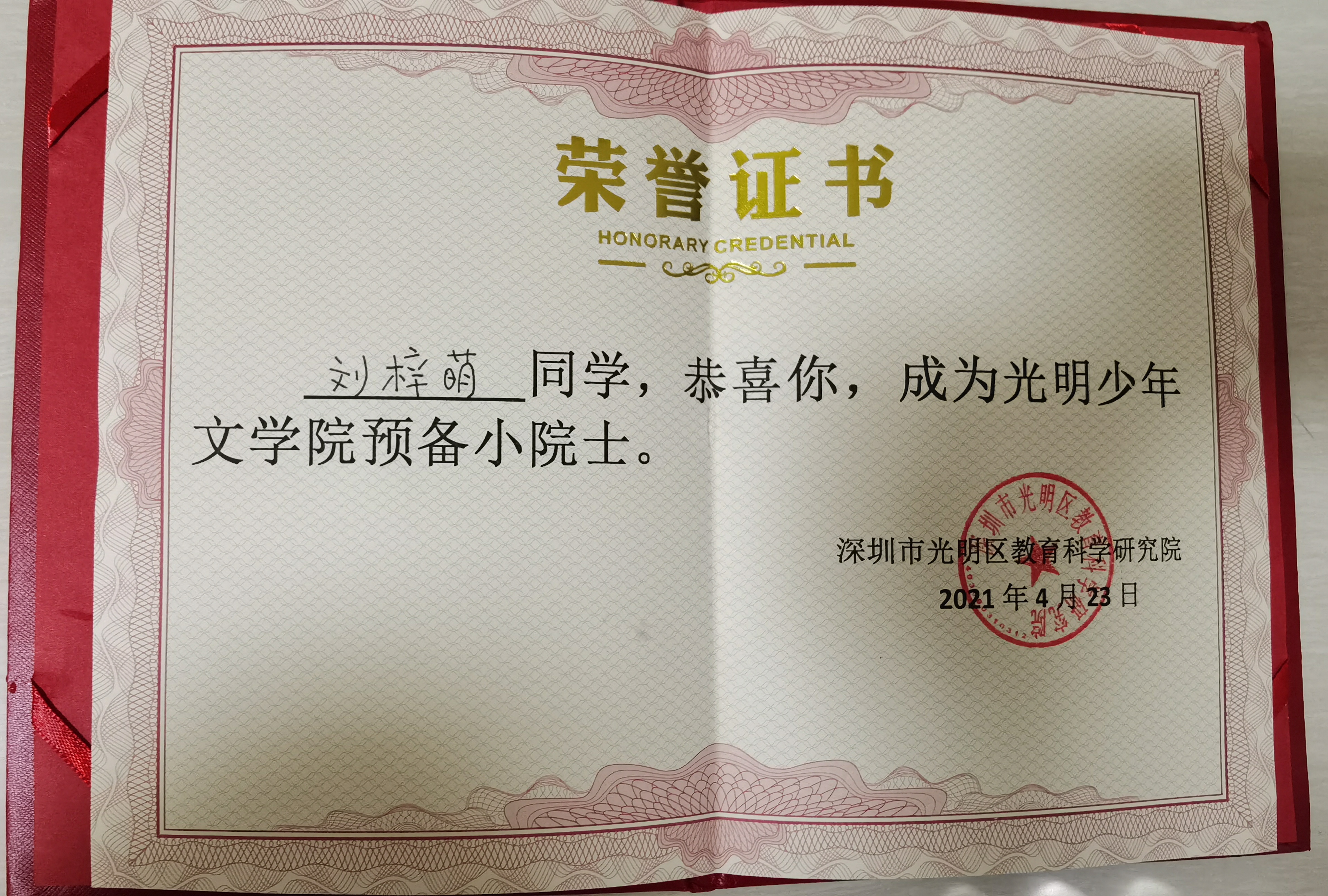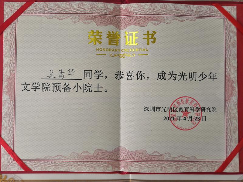 在光明區(qū)少年文學院評選中,學校獲批成立“光明區(qū)少年文學院分院”,陳沐文老師擔任文學院期刊編輯,方汶琪、劉梓萌、吳青華三位同學被授予“預備小院士”稱號。