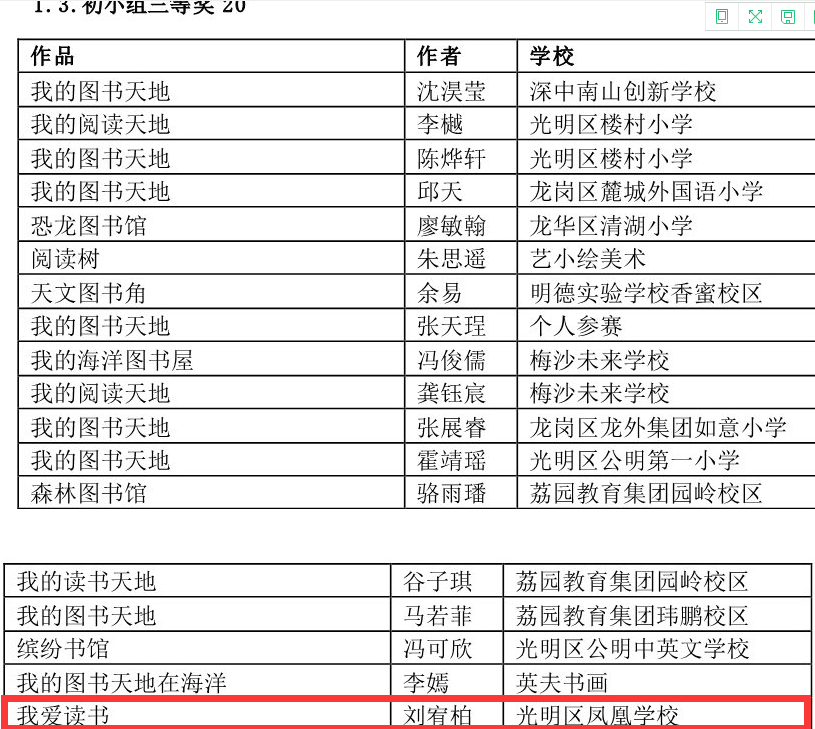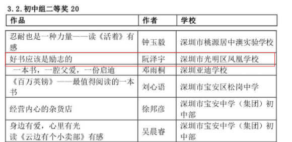 在深圳市4·23世界讀書日“探索閱讀新領域”創(chuàng)作比賽中學校榮獲優(yōu)秀組織獎,何雨晴、劉宥伯同學分別獲初小組二等獎、三等獎;阮澤宇、張雪怡同學分別榮獲初中組二等獎、三等獎。郭瑞芳老師榮獲優(yōu)秀指導老師獎,曾嵽稜、賴美君、李海亮榮獲優(yōu)秀組織老師獎。