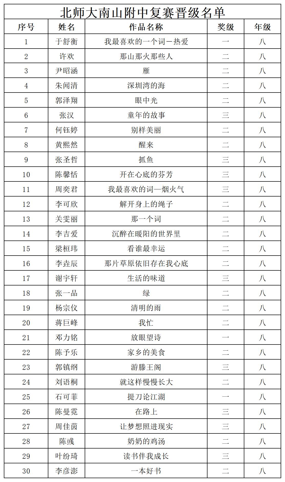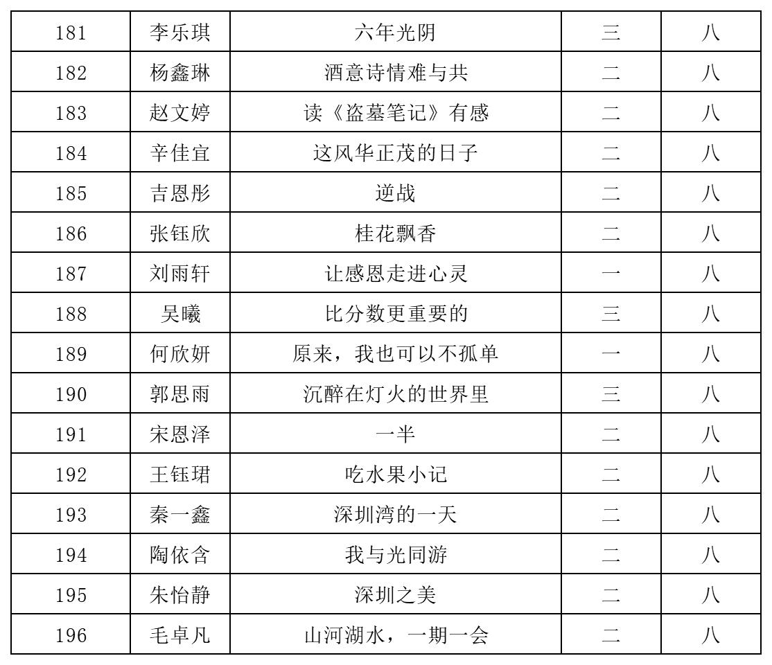 自2021年1月,活動(dòng)征稿啟動(dòng)以來(lái),獲得了深圳市廣大中小學(xué)生、教師、文學(xué)愛好者的熱烈響應(yīng)積極參與,吸引了深圳百余所學(xué)校的上萬(wàn)人關(guān)注報(bào)名?,F(xiàn)公布北師大南山附屬學(xué)校中學(xué)部晉級(jí)復(fù)賽名單如下: