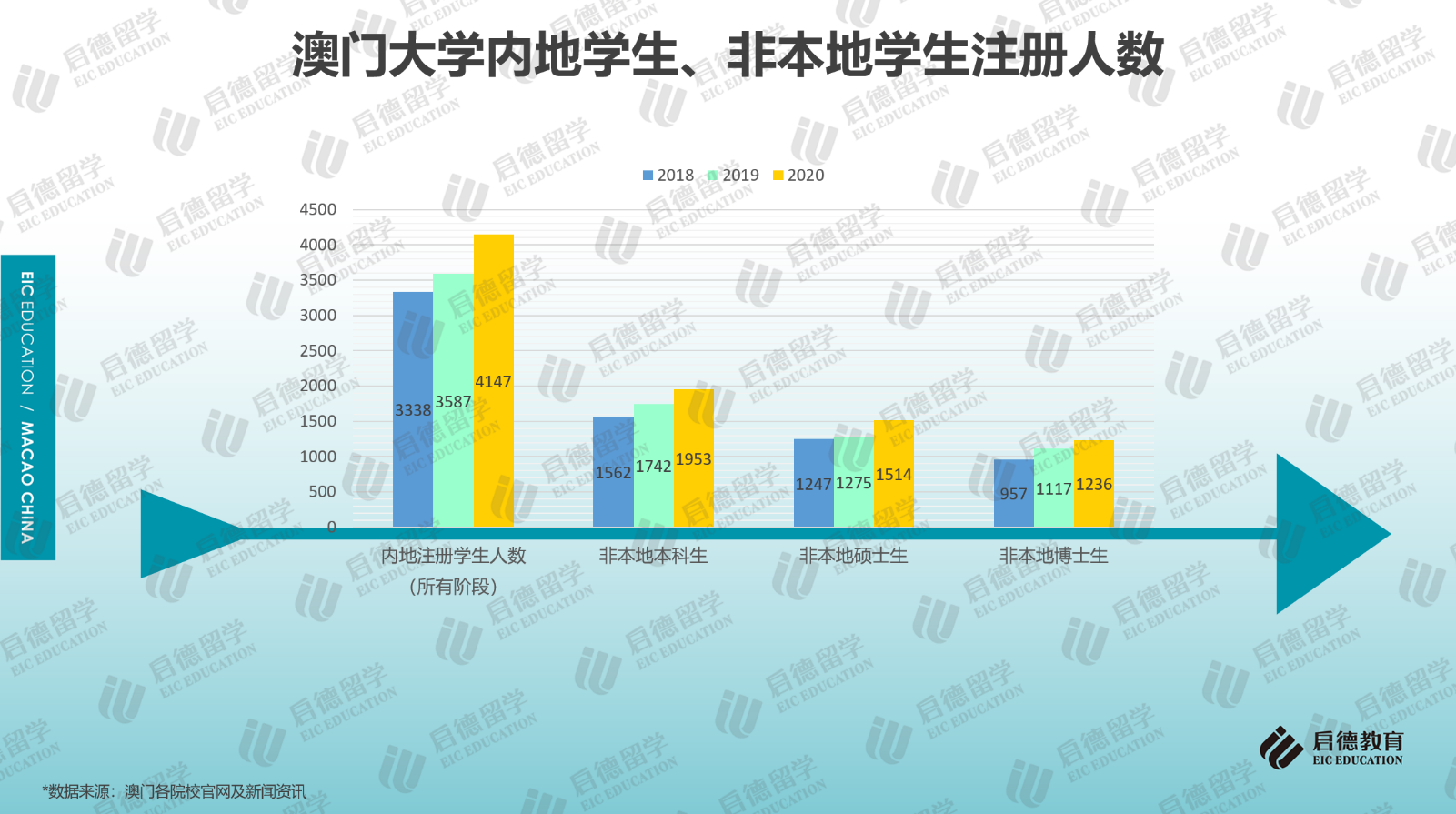 最近幾年,內(nèi)地學(xué)生赴澳門求學(xué)的人數(shù)保持增長,據(jù)澳門大學(xué)官網(wǎng)數(shù)據(jù)顯示,2020年,赴澳門大學(xué)求學(xué)的內(nèi)地注冊學(xué)生人數(shù)為4147人,相比2019年上漲了15.61%,相比2018年上漲了24.23%;2021/2022學(xué)年,澳門科技大學(xué)本科課程的內(nèi)地報名人數(shù)超過18000人,澳門城市大學(xué)本科課程的內(nèi)地報名人數(shù)接近13000人,計劃錄取866人,報錄比達(dá)到15:1。此外,2020年澳門大學(xué)本科(1953人)、碩士(1514人)、博士(1236人)階段的非本地生人數(shù)均呈穩(wěn)步上升,非本地學(xué)生包括來自中國內(nèi)地及其它國家與地區(qū)的學(xué)生。澳門高等院校的申請競爭遠(yuǎn)比想象中激烈。