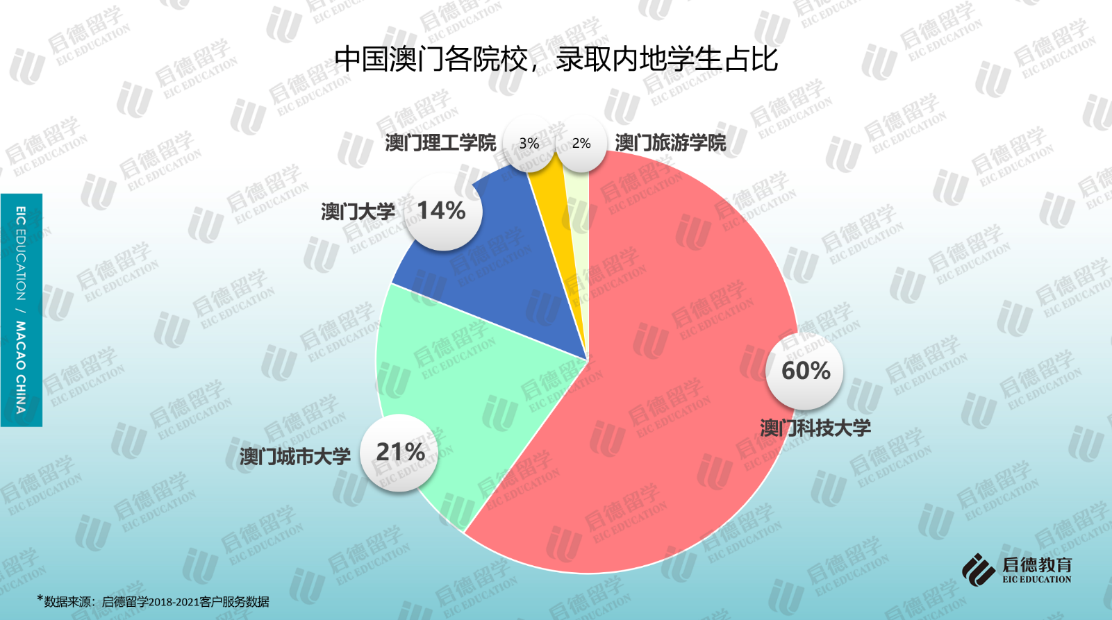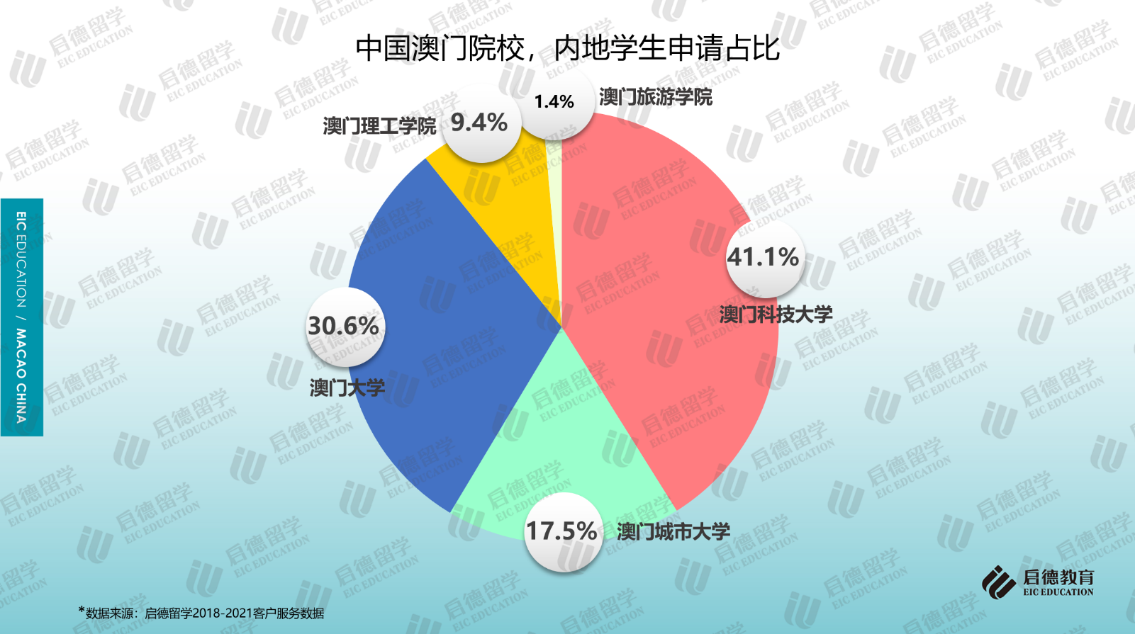 啟德留學(xué)2018-2021客戶服務(wù)數(shù)據(jù)顯示,澳門地區(qū)高校的申請中,七成以上申請澳門科技大學(xué)(41.1%)和澳門大學(xué)(30.6%);作為私立院校的澳門城市大學(xué)因?qū)W科設(shè)置比較全面,申請占比為17.5%;作為公立院校的澳門理工學(xué)院(9.4%)、澳門旅游學(xué)院(1.4%)由于專業(yè)設(shè)置較少,申請占比相對較少。從啟德留學(xué)澳門地區(qū)高校的錄取數(shù)據(jù)來看,澳門科技大學(xué)的錄取占比為60%,澳門大學(xué)的錄取占比為14%,澳門城市大學(xué)、澳門理工學(xué)院、澳門旅游學(xué)院的錄取占比分別為21%、3%與2%。