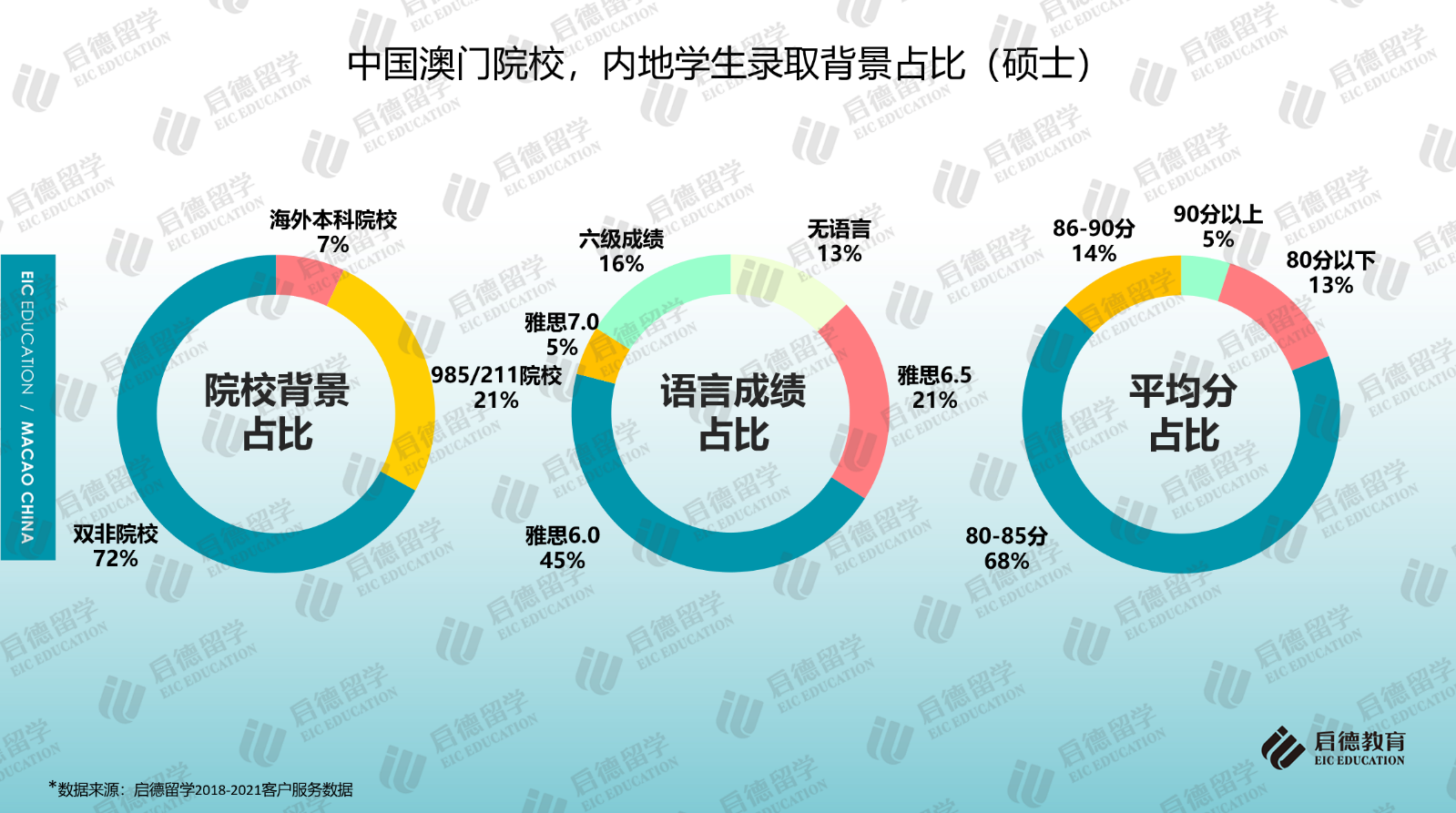 本科錄取中,澳門大學(xué)的要求較高,應(yīng)屆高考生申請人高考成績要達(dá)到一本線;碩士錄取中,只有澳門大學(xué)和澳門旅游學(xué)院要求碩士申請學(xué)生提交英語成績,雅思6分為澳門大學(xué)和澳門旅游學(xué)院的語言門檻要求,澳門大學(xué)碩士申請也可接受430分以上六級和TEM4/8成績;其它院校的大多數(shù)專業(yè)對英語成績無硬性要求。啟德留學(xué)2018-2021客戶服務(wù)數(shù)據(jù)顯示,2021年碩士錄取學(xué)生中,45%達(dá)到雅思6分的門檻成績,雅思成績6.5分以上達(dá)到26%,16%的學(xué)生只提供了合格的六級成績,13%為無語言錄??;七成以上的碩士錄取學(xué)生來自雙非院校;GPA在80分以上的占比為87%。
