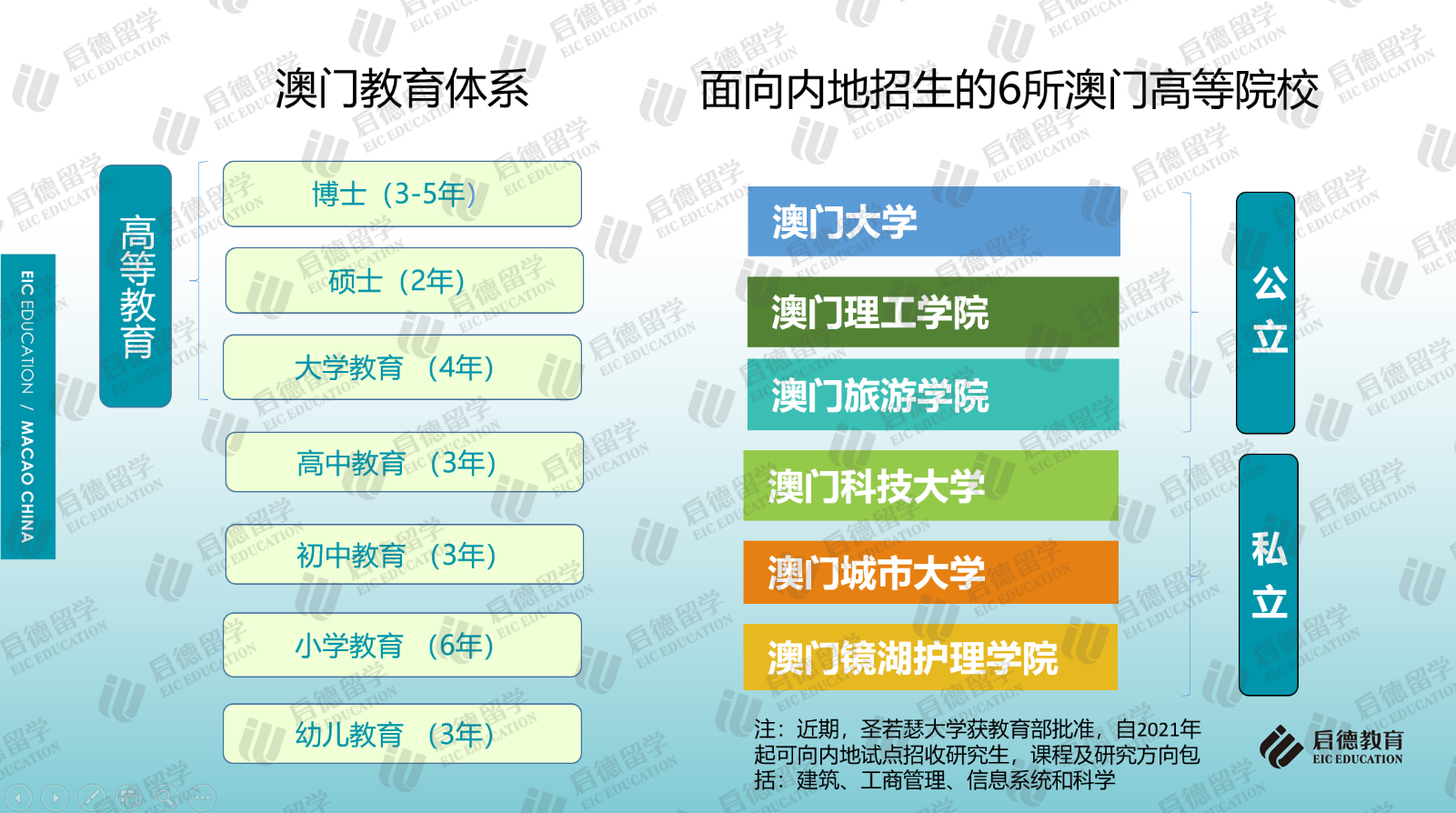 作為中西文化交匯的國際旅游城市,中國澳門的輕工業(yè)、旅游業(yè)、酒店業(yè)和娛樂場使其成為中外游客青睞的旅游度假勝地。澳門與香港同樣都具有獨(dú)特的地緣優(yōu)勢,既有中國文化的根基,又融會貫通了歐美教育的優(yōu)勢,中文、葡文、英文學(xué)制并存的多語言教學(xué)與多元文化交融的國際化環(huán)境,為學(xué)生提供了開闊的國際視野和學(xué)術(shù)氛圍,也為當(dāng)?shù)馗叩冉逃陌l(fā)展創(chuàng)造了良好的條件。目前,澳門大學(xué)、澳門理工學(xué)院、澳門旅游學(xué)院、澳門城市大學(xué)、澳門鏡湖護(hù)理學(xué)院、澳門科技大學(xué)等6所高校獲教育部批準(zhǔn)可面向內(nèi)地招收本科生及研究生,圣若瑟大學(xué)獲教育部批準(zhǔn)自2021年起可面向內(nèi)地試點(diǎn)招收研究生。
