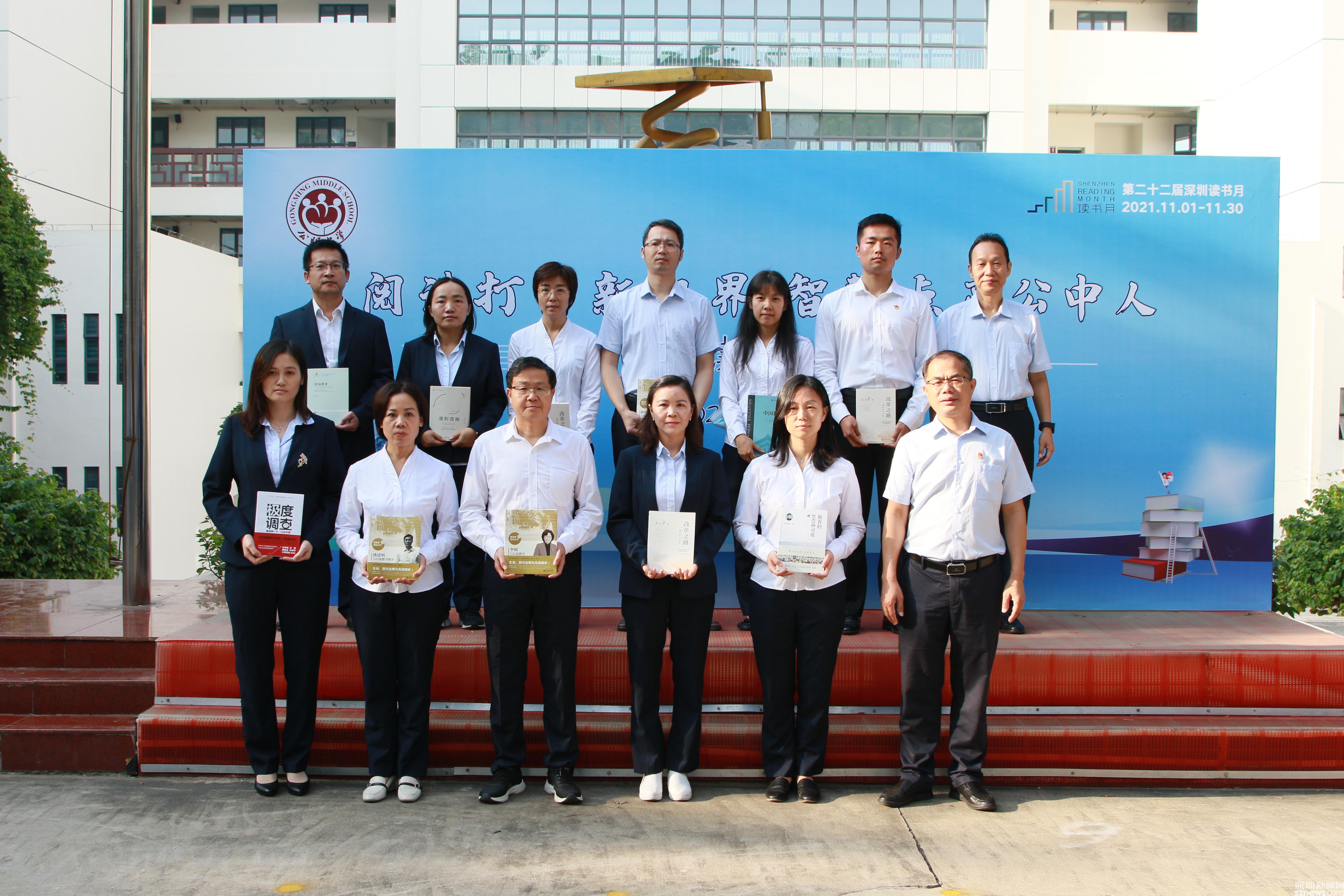啟動(dòng)儀式上,初二(15)班全體學(xué)生帶來(lái)的朗誦《我愿意 奮斗終生》,催人覺醒;深圳市閱讀推廣人范世華攜公明中學(xué)各年級(jí)閱讀之星代表——初三(8)李詩(shī)晨、初二(8)宛錚、初一(2)班胡立麒,共同向全校師生發(fā)出讀書、愛書的倡議;華建明校長(zhǎng)、梁吉清副校長(zhǎng)向?qū)W校各學(xué)科科組長(zhǎng)贈(zèng)書,希望科組長(zhǎng)帶動(dòng)備課組一起讀好書,研究書,用好書,通過(guò)博而精的閱讀提升人文素養(yǎng),建設(shè)學(xué)習(xí)型教師共同體,進(jìn)而更好在學(xué)生心中種下讀書的種子。