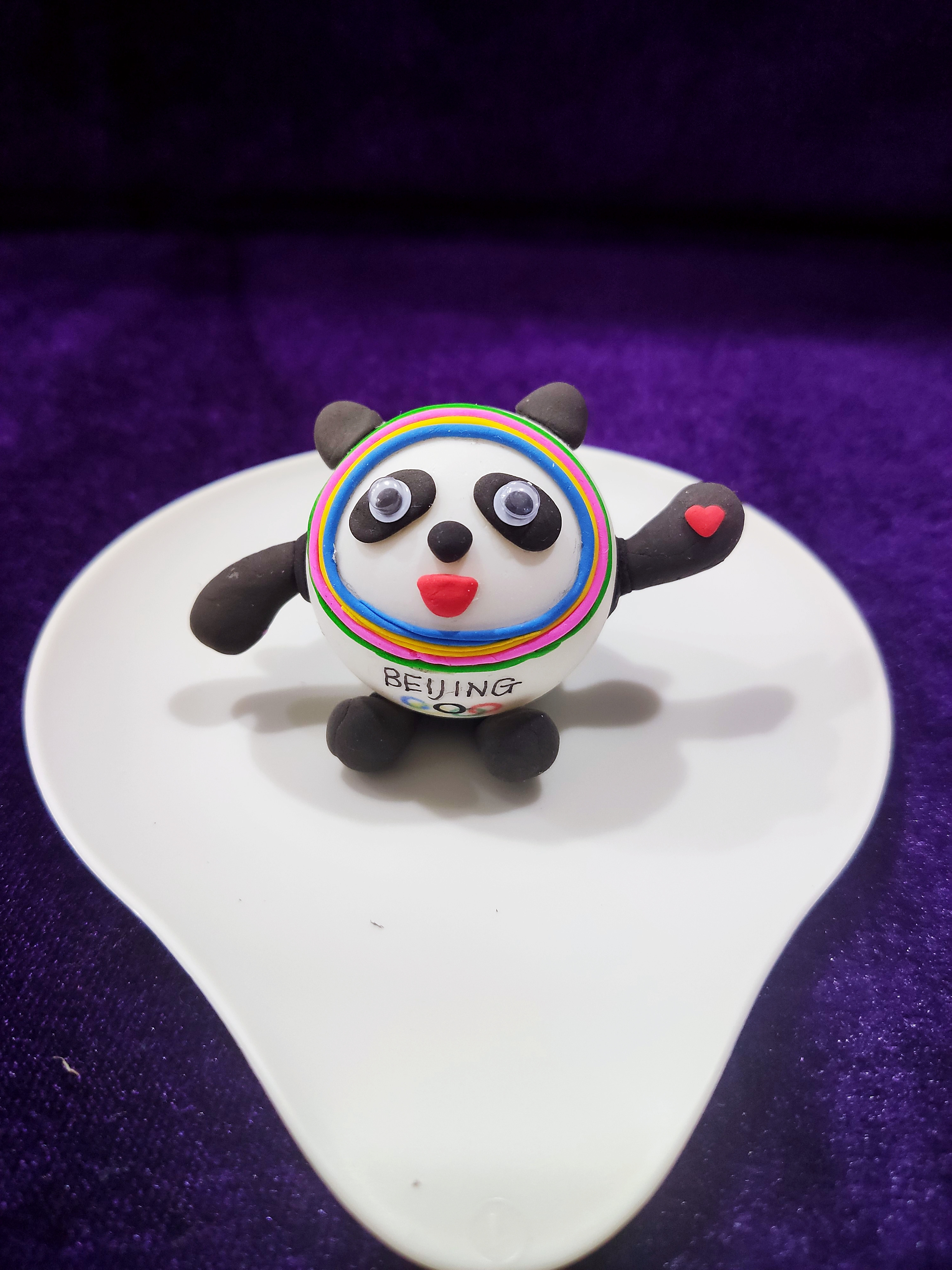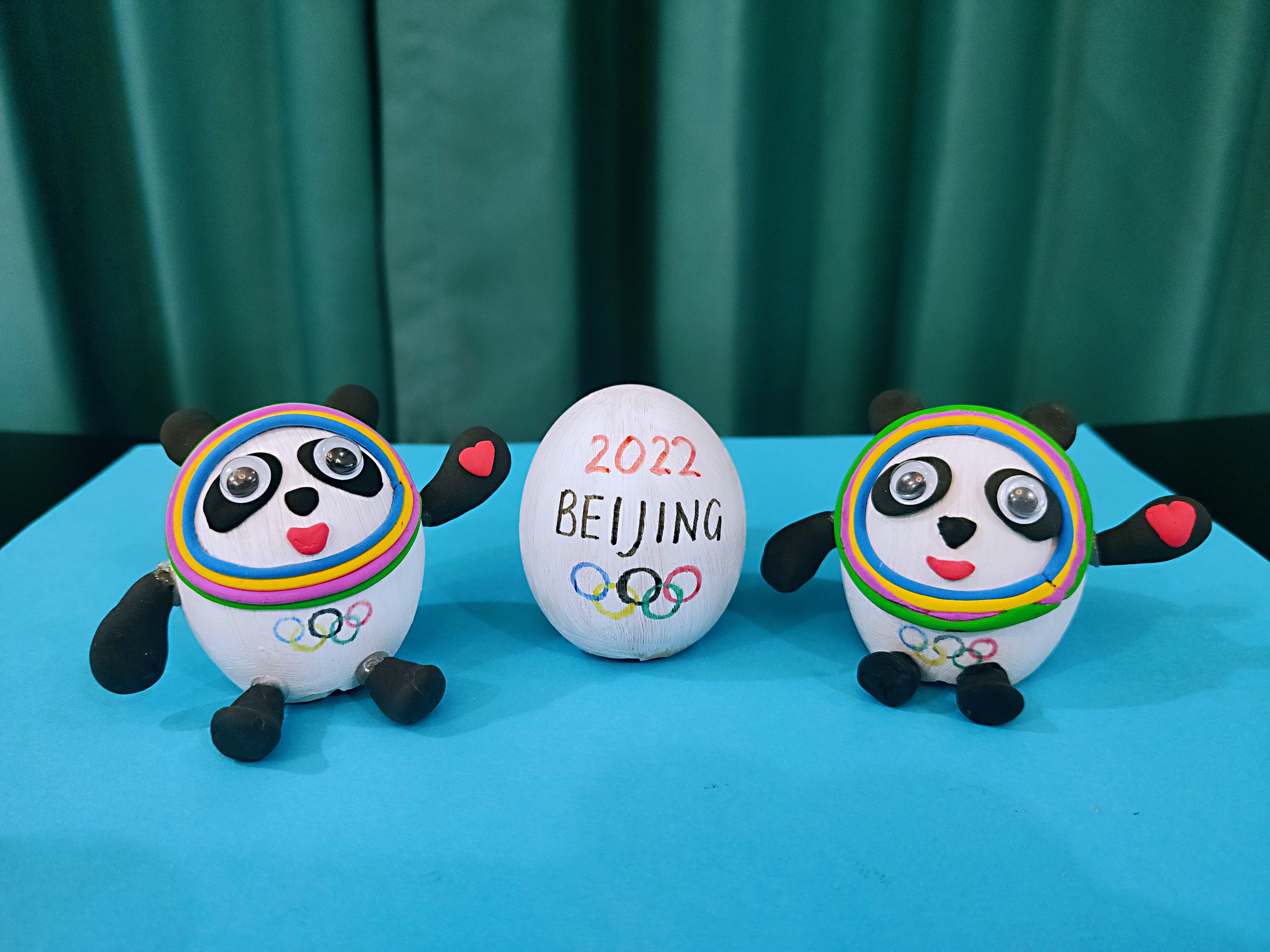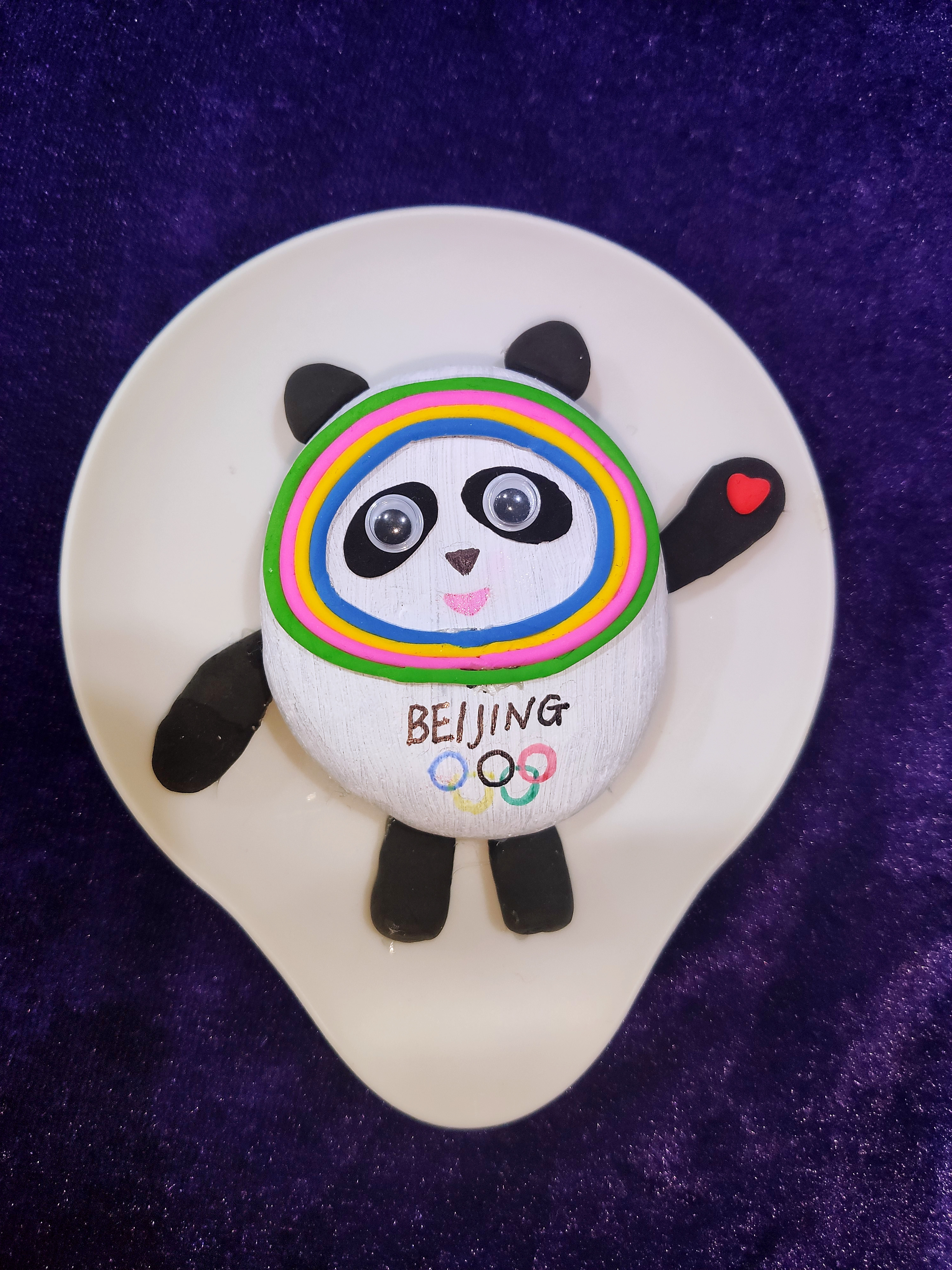 為了不讓蛋殼滾來滾去,我把蛋殼套到了瓶子上,第一步是給蛋殼刷上白色的顏料,晾干,再用輕黏土制作冰墩墩的五官和四肢。制作過程中,我遇到了難題——冰墩墩臉上的彩色光環(huán)可怎么做?我到到網(wǎng)上仔仔細細地觀察了冰墩墩的光環(huán),想到了解決辦法,最后我的蛋殼冰墩墩做好了。