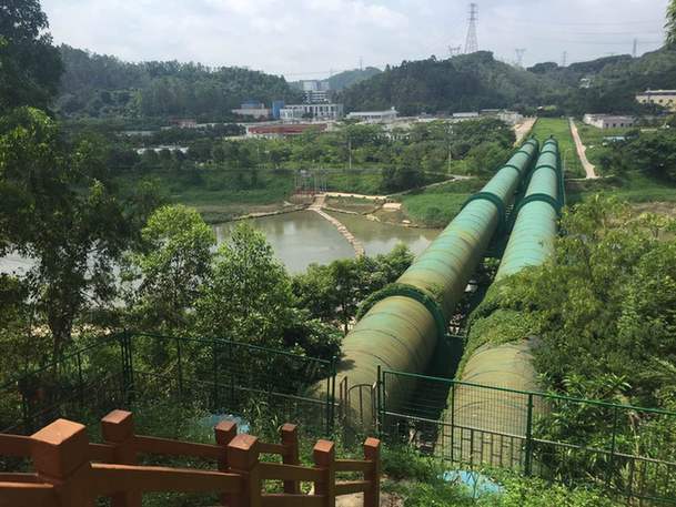 【直播君】:經(jīng)過一路跋涉,直播小分隊已經(jīng)到達(dá)今天的第一站坑梓水庫啦,先看看地面這一條條引水管道,水庫全貌航拍圖馬上新鮮出爐!