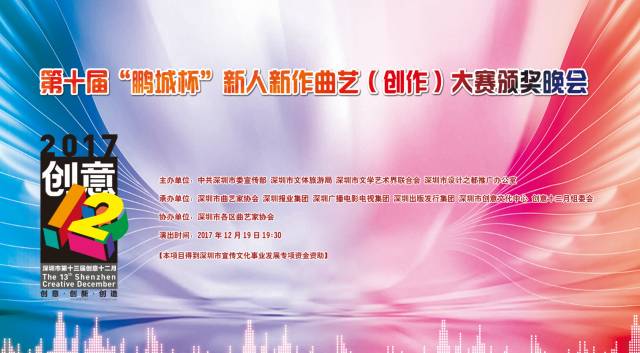 深圳市“鵬城杯”新人新作曲藝大賽作為深圳市文學(xué)藝術(shù)界聯(lián)合會重點長效品牌活動和“創(chuàng)意十二月”活動之一,得到省、市相關(guān)部門領(lǐng)導(dǎo)的重視和大力支持,至今已成功舉辦九屆,大賽分為創(chuàng)作和表演兩種形式輪流舉辦,2017年為創(chuàng)作大賽。