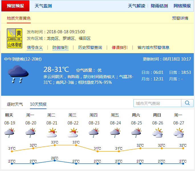 深圳市氣象臺預(yù)計,18日深圳多云間陰天,有陣雨,部分時間雨勢較大,氣溫26-30℃;19日多云有陣雨或雷陣雨;20-23日多云,有短時陣雨,陽光增多,天氣趨于炎熱。