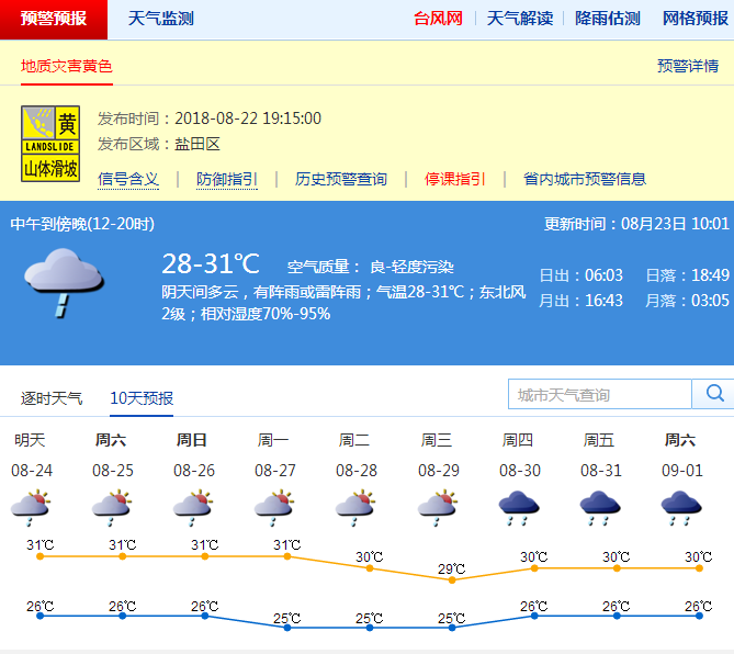 市氣象臺預測,24日-29日,多云到陰天,有陣雨或雷雨,部分時間雨勢較大。最低氣溫26℃左右,最高氣溫31℃左右。近來深圳降雨較多,容易導致泥土松動,市民外出應注意遠離邊坡等危險地帶。(記者 李秀瑜)