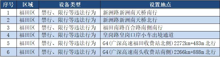 另外,重點(diǎn)整治機(jī)動(dòng)車禁行、限行等多種違法行為的交通技術(shù)監(jiān)控設(shè)備,深圳交警公布啟用87套。涉及福田區(qū)、羅湖區(qū)、南山區(qū)、寶安區(qū)、龍崗區(qū)、龍華區(qū)、光明新區(qū)、坪山區(qū)、大鵬新區(qū)等9個(gè)區(qū)域。