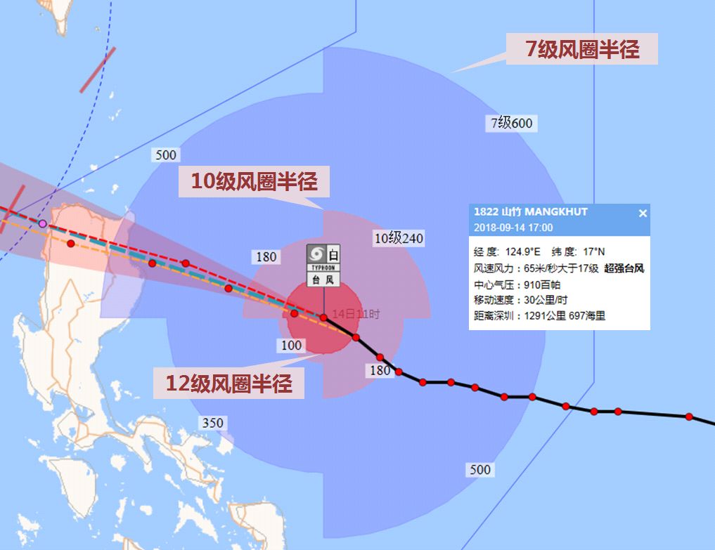 9月14日17時(shí)其位于距我市1291公里的菲律賓以東洋面,中心風(fēng)力17級(jí)以上(65米/秒,相當(dāng)于234公里/小時(shí)),中心最低氣壓910百帕,將以30公里/時(shí)的速度向西北方向移動(dòng)。
