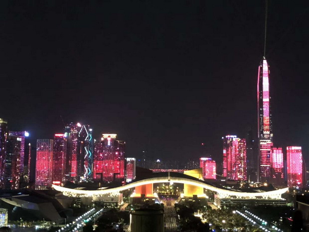 這臺別開生面的晚會,主舞臺設(shè)在市民中心廣場,舞臺后方呈現(xiàn)著深圳市精心打造的福田中心區(qū)43座樓宇燈光秀,五彩斑斕、綺麗多姿的深圳城市新夜景,與晚會現(xiàn)場舞臺融為一體,為市民和廣大觀眾呈現(xiàn)出一個迷人的“深圳之夜”。