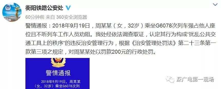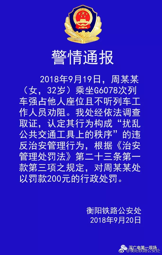 經(jīng)衡陽鐵路公安處經(jīng)依法調(diào)查取證,認(rèn)定其行為構(gòu)成“擾亂公共交通工具上的秩序”的違反治安管理行為,根據(jù)《治安管理處罰法》第二十三條第一款第三項之規(guī)定,對周某某處以罰款200元的行政處罰。