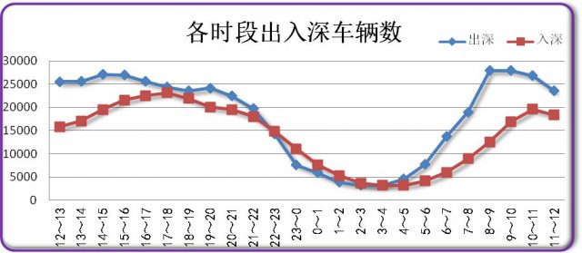 繼22日出入深平穩(wěn)有序的狀況,今天目前我市主要出入深道路運行正常,從6時開始,出深車流開始增加,8時至9時達(dá)到峰值,達(dá)2.8萬輛次,整體行車狀況較好,道路較為通暢。