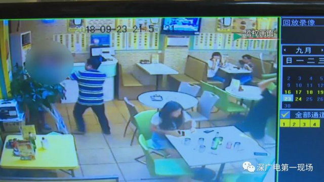 從監(jiān)控視頻可以看到,一名身穿黑色短袖的男子,自從進(jìn)入這家新皇馬茶餐廳后,就開始一邊跟身邊的朋友聊天,一邊抽煙。