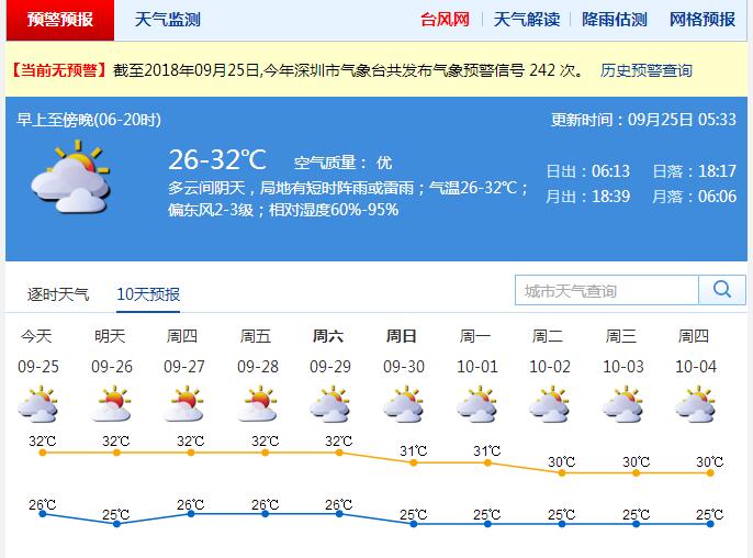 市氣象臺(tái)預(yù)測,26日,受偏東氣流影響,多云間陰天,有短時(shí)雷陣雨,氣溫為25-32℃。27日起,轉(zhuǎn)東北風(fēng)影響,天氣晴朗,最高氣溫32-33℃。預(yù)計(jì)超強(qiáng)臺(tái)風(fēng)“潭美”將趨向呂宋島以東洋面,未來幾天對(duì)深圳無風(fēng)雨影響。(記者李秀瑜)