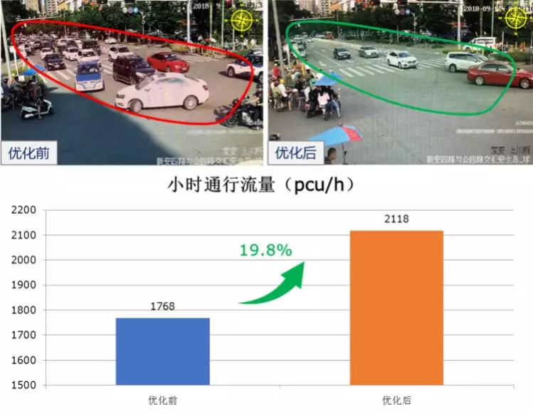 公園路為寶安中心城區(qū)主干道,為減少車車交織、改善行車秩序,9月11日,深圳交警將該路口由原先南北早起遲斷、東西對放的相位調(diào)整為北、東、南、西順時針輪放的4相位放行模式,優(yōu)化后,東西、南北行車秩序明顯改善,車車交織現(xiàn)象消失,小時通行流量由1768pcu/h提高至2118pcu/h,提升約19.8%。