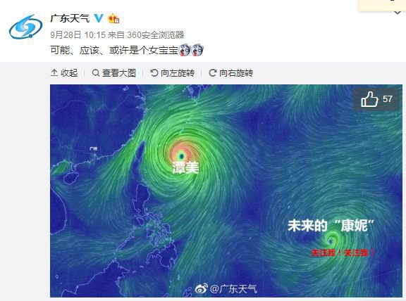 另據(jù) @廣州天氣,"潭美"28-29日最接近臺(tái)灣,隨后掉頭往東北方向移動(dòng),國(guó)慶期間前往臺(tái)灣的朋友不用擔(dān)心。