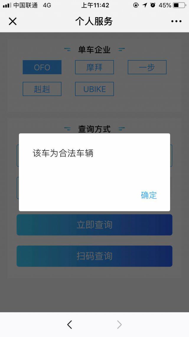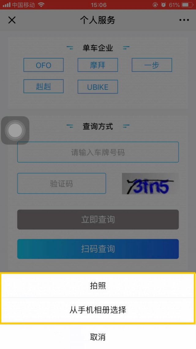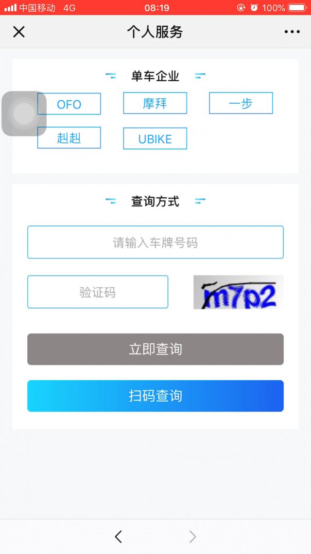提交完手機(jī)號(hào)和驗(yàn)證碼之后,我們就來到了這個(gè)頁面,在這里,你可以選擇你要查詢的共享單車的品牌,品牌選擇完畢后,你可以選擇手動(dòng)輸入車牌號(hào)碼或掃碼查詢!