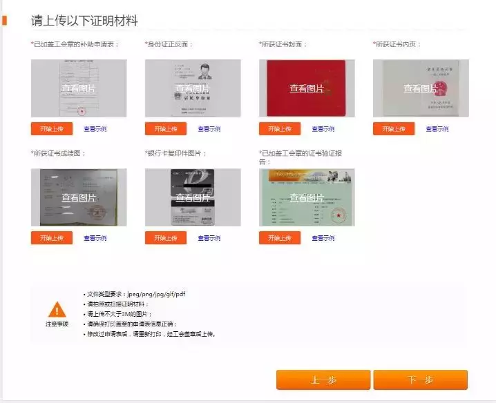3.進(jìn)入證明資料上傳頁面,將準(zhǔn)備好的資料進(jìn)行上傳,全部上傳完后,點(diǎn)擊【下一步完成提交】;