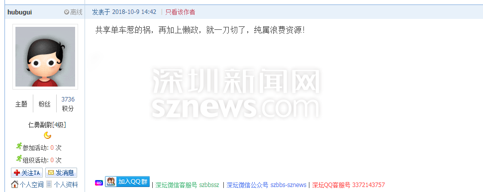 在深圳不斷推進的城市建設(shè)進程中,共享單車的禍,就不應(yīng)該由全體市民來“埋單”,更不應(yīng)該以犧牲市民的幸福感作為“除禍”的妙招。我們都期待,未來的深圳能用更合理、更人性化的措施,代替簡單粗暴的“一刀切”。