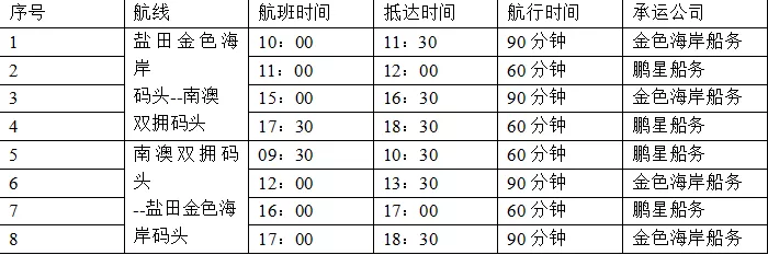 鹽田金色海岸碼頭至南澳雙擁碼頭公共交通航班時間及價目表