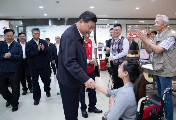 24日上午,社區(qū)居民張瑩瑩正在社區(qū)圖書館查閱資料,習近平總書記向她走來,與她親切交流。張瑩瑩5歲的時候因為小兒麻痹癥落下了腿疾,行動不便。她告訴總書記,社區(qū)有300多名殘疾人士,這里有專門為殘疾居民設計的戶型。