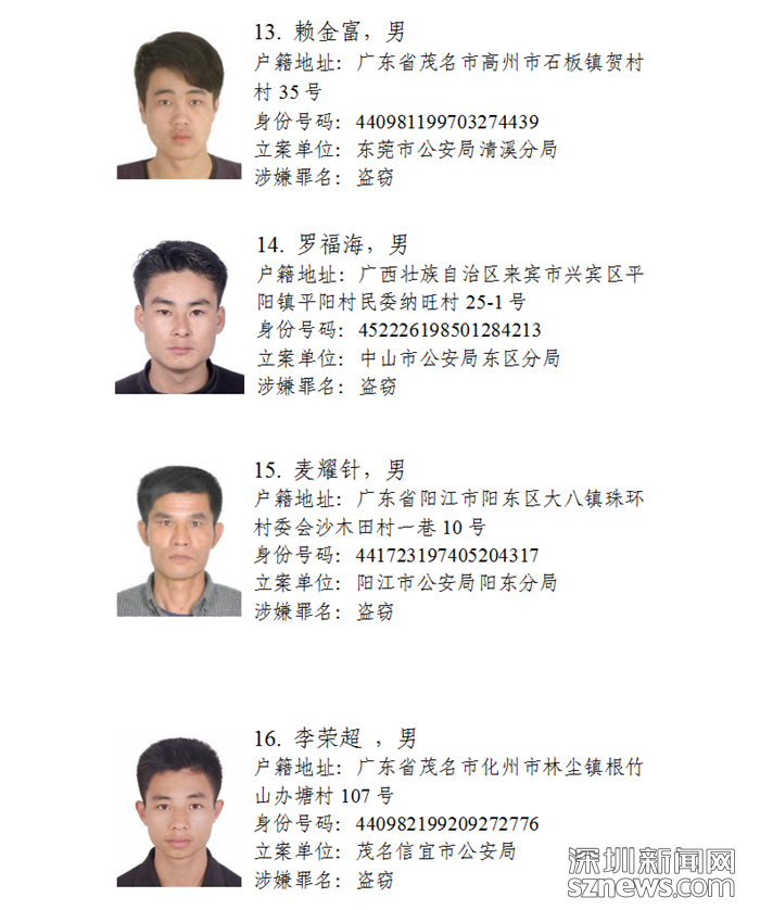 深圳新聞網(wǎng)11月5日訊(記者何暢)廣東省公安廳近日發(fā)布懸賞通告:廣東省公安廳決定從即日起公開(kāi)懸賞通緝30名在逃涉盜搶騙犯罪嫌疑人,希望廣大人民群眾積極提供在逃犯罪嫌疑人線索。