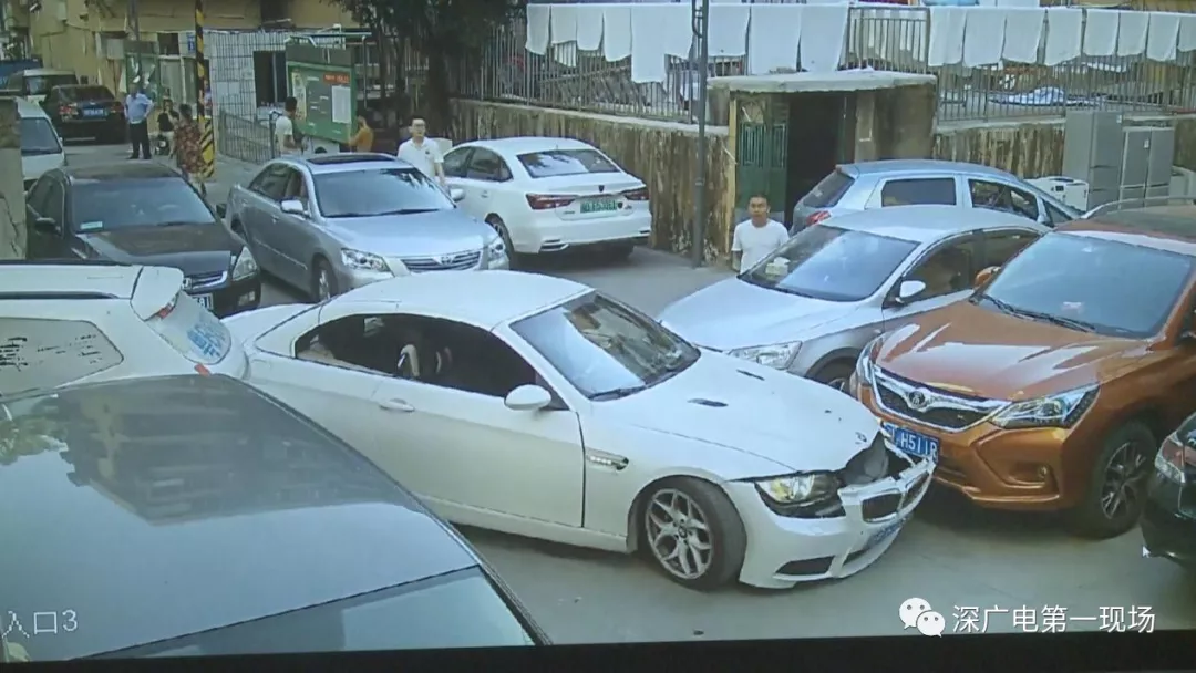 從監(jiān)控畫面中可以看到,粵E牌白色寶馬小車,在原本就擁擠的停車路段內(nèi),不停地前進(jìn)倒退,走著奇怪的路線,在倒車時他接連將停放路旁的車輛撞了個遍,隨后便卡在了路中。