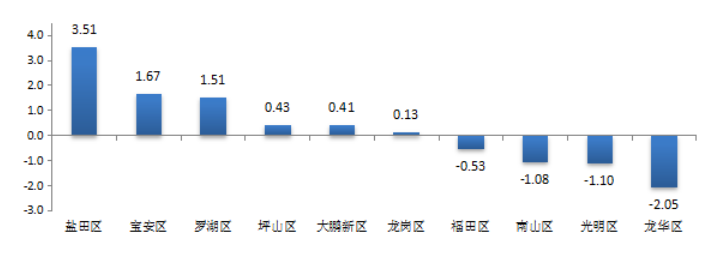 從各區(qū)(新區(qū))城市交通文明進步指數(shù)來看,福田區(qū)、羅湖區(qū)、鹽田區(qū)、寶安區(qū)、坪山區(qū)和大鵬新區(qū)均有所進步,其中寶安區(qū)進步最大,進步指數(shù)為2.08%,鹽田區(qū)次之,進步指數(shù)為1.72%;而南山區(qū)、龍崗區(qū)、光明區(qū)和龍華區(qū)則有所退步,其中龍華區(qū)和龍崗區(qū)退步較大,進步指數(shù)分別為-1.53%和-1.22%(見圖4)。