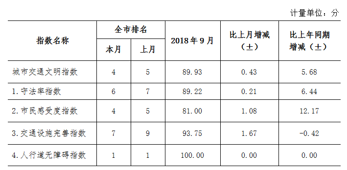 9月份深圳市城市交通文明指數(shù)為87.02分。與上月對比,四項分項指數(shù)呈“三升一降”現(xiàn)象。