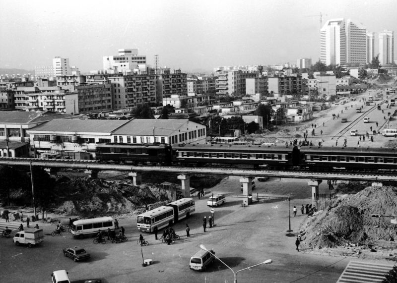 1985年,建設(shè)者們在深圳火車站人行天橋施工。 呂翔 攝