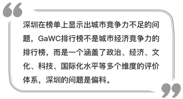 從GaWC發(fā)布的榜單和評價體系可以看出,深圳雖然在經(jīng)濟實力和經(jīng)濟總量上已經(jīng)取得了較大發(fā)展,但城市國際綜合競爭力尤其是城市軟實力還存在明顯差距,“偏科”的現(xiàn)象仍然沒有改變。