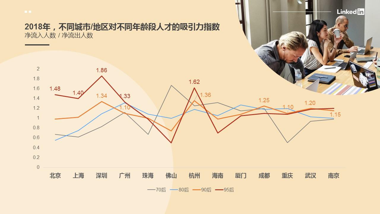 在此前的調(diào)研中,領(lǐng)英數(shù)據(jù)顯示90/95后年輕職場人的平均在職時間顯著降低,為了追求更好的工作機會他們不介意頻繁跳槽。而這樣的高流動性同樣也體現(xiàn)在城市的變動上。以職場人總工作年限/所有生活工作過的城市數(shù)量為衡量依據(jù),領(lǐng)英大數(shù)據(jù)顯示:職場人城市間流動頻率,呈現(xiàn)出隨年齡的降低而增高的趨勢,年輕一代在城市方面的流動性越來越強。