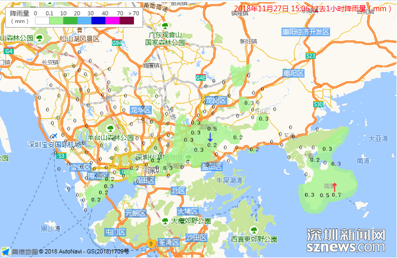 市氣象局監(jiān)測過去1小時降雨量(數(shù)據(jù)更新于11月27日15時06分)