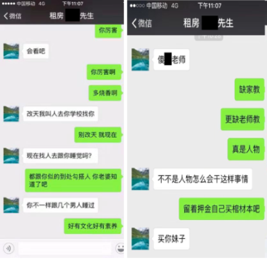 追索押金的過程并不平靜。10月13號(hào)的一次微信溝通中,余某亮對李小姐以文字和色情圖片進(jìn)行人身恐嚇、辱罵和性騷擾。記者還獲悉,余某亮至少對2人女租客進(jìn)行過性騷擾,也有男租客稱受到余某亮等人的人身恐嚇。