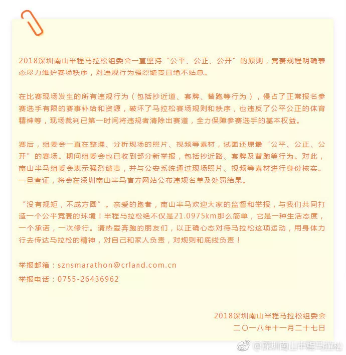 27日,南山半馬賽事組委會(huì)通過(guò)微博發(fā)布聲明稱(chēng),在比賽現(xiàn)場(chǎng)發(fā)生的所有違規(guī)行為,侵占了正常報(bào)名參賽選手有限的賽事補(bǔ)給和資源,破壞了馬拉松賽場(chǎng)規(guī)則和秩序,也違反了公平公正的體育精神等,現(xiàn)場(chǎng)裁判已第一時(shí)間將違規(guī)者清除出賽道,全力保障參賽選手的基本權(quán)益。