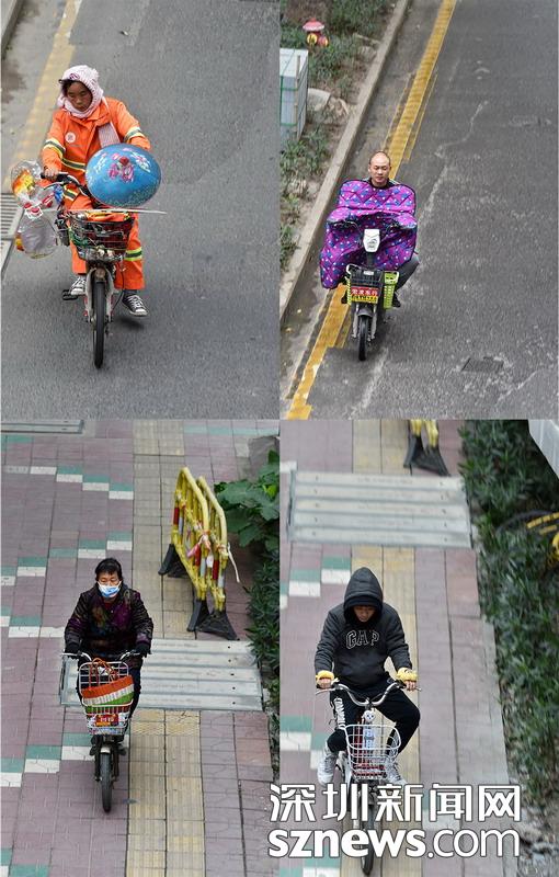 氣溫驟降,騎行更覺寒冷,往來(lái)騎車的市民使用各種保暖措施御寒。