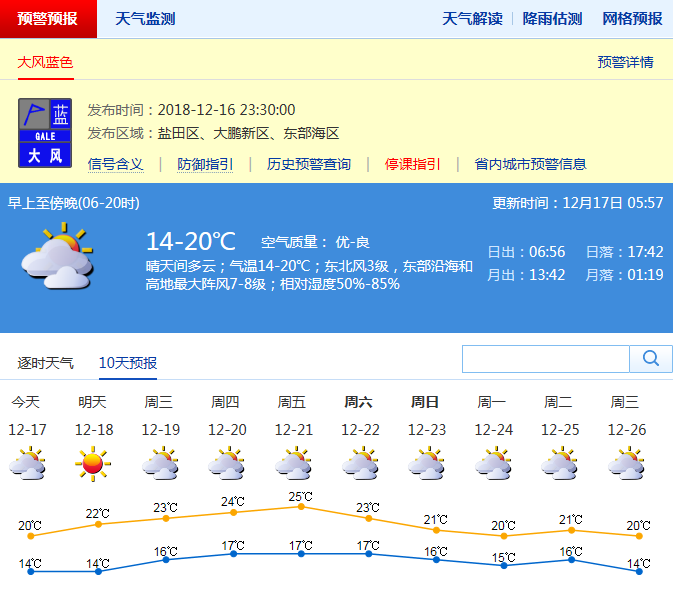 受冷空氣影響,近來深圳氣溫下降,本周前期冷空氣持續(xù)影響,17日~18日深圳晴天間多云,早晚清涼,白天溫暖,空氣干燥。其中17日北風(fēng)較大,沿海和高地最大陣風(fēng)6級(jí)~7級(jí),氣溫14℃~19℃。