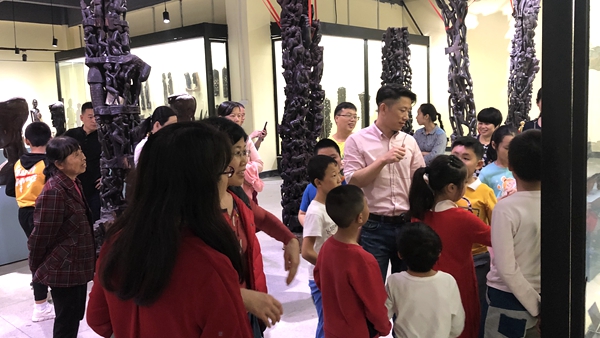 也許是被熱情的笑容和鼓舞所感染,天真活潑的小朋友們一到現場便與非洲大哥哥大姐姐們迅速的打成一片,毫無距離感。在非洲哥哥姐姐們的鼓聲引領下,同學們首先來到非洲文化博物館,由于大家都是第一次接觸非洲藝術品,哇哇哇的贊嘆聲此起彼伏,博物館工作人員瞬間被大家緊緊包圍,對各種藝術品提出了無數個五花八門的問題,真正成了“十萬個為什么”“案發(fā)現場”?!榜R賽人為什么住牛糞房子啊?”“木頭為什么是黑色的啊”“坐了酋長椅是不是就可以做酋長了?”……由于同學們第一次這么近距離接觸非洲文化,實在是太好奇太熱情,與各種藝術品親密接觸拍照、坐酋長椅體驗“做酋長”的感覺、甚至工作人員也“網開一面”讓大家騎在大象和獅子木雕上盡情玩耍,導致原本計劃半小時的參觀時間足足一個半小時才結束。