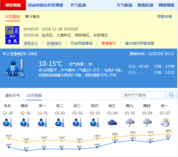 深圳新聞網(wǎng)2018年12月29日訊(記者 陳婕)深圳市氣象局預(yù)計(jì),29日-元月3日受冷空氣持續(xù)影響,氣溫顯著下降,天氣持續(xù)寒冷,最低氣溫將降至7-8℃,沿海和高地有7-9級(jí)偏北大風(fēng),間中有小雨。寒冷天氣將持續(xù)6天左右。