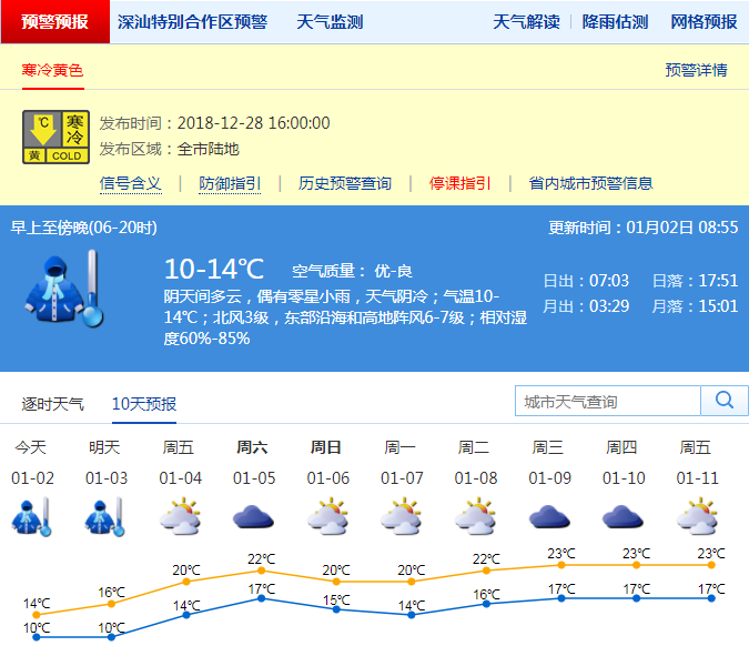 深圳新聞網2019年1月2日訊(記者 陳婕)記者從深圳市氣象局了解到,2日有分散小雨;9-13℃;北風3級,東部沿海和高地陣風6-7級;濕度60%-85%。預計3日持續(xù)陰冷;4-5日陰天間多云,偶有零星小雨,最低氣溫明顯回升;6日起多云到晴天,氣溫小幅波動。