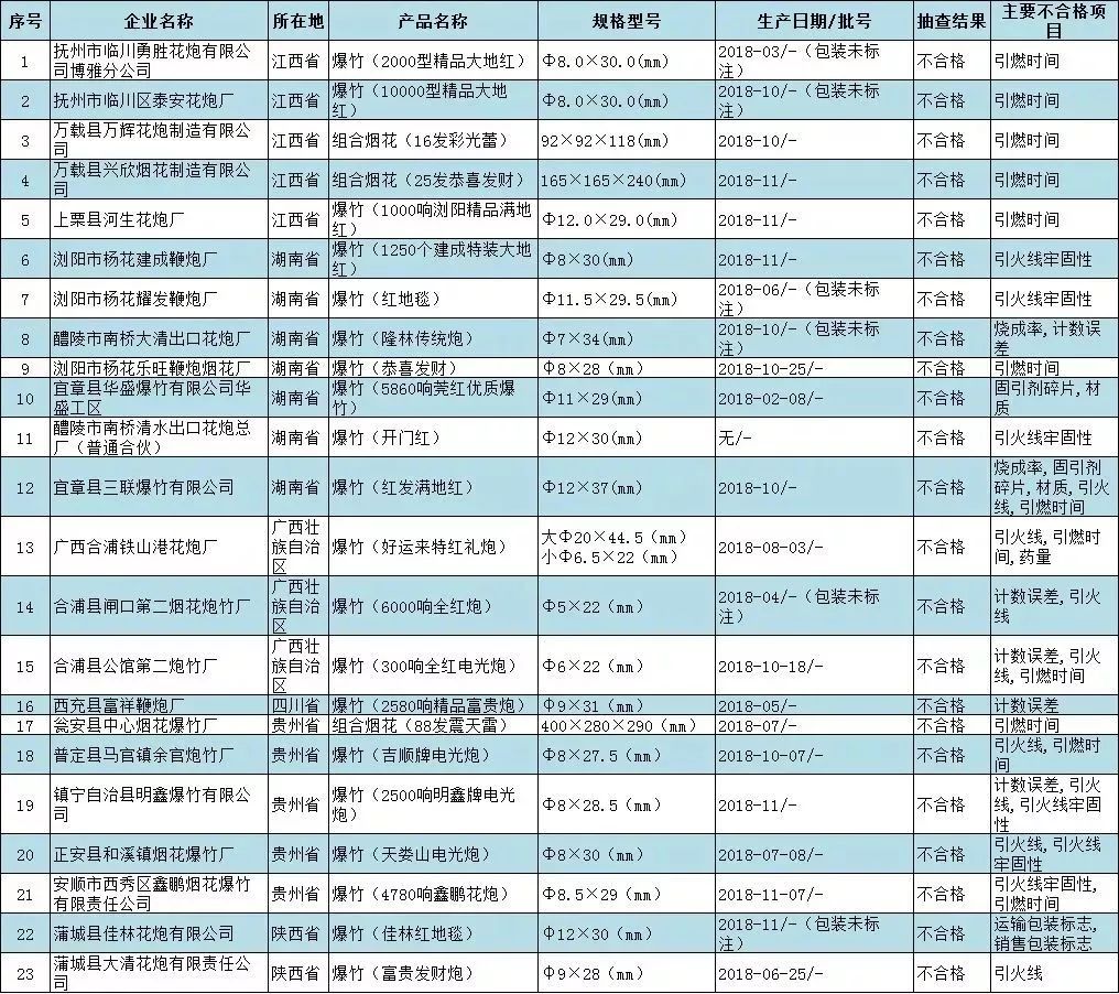 ③國(guó)家市場(chǎng)監(jiān)管總局日前組織開(kāi)展煙花爆竹產(chǎn)品質(zhì)量國(guó)家監(jiān)督專項(xiàng)抽查,共抽查6個(gè)省(自治區(qū))150家企業(yè)生產(chǎn)的150批次產(chǎn)品,檢出23批次不合格,不合格發(fā)現(xiàn)率為15.3%。